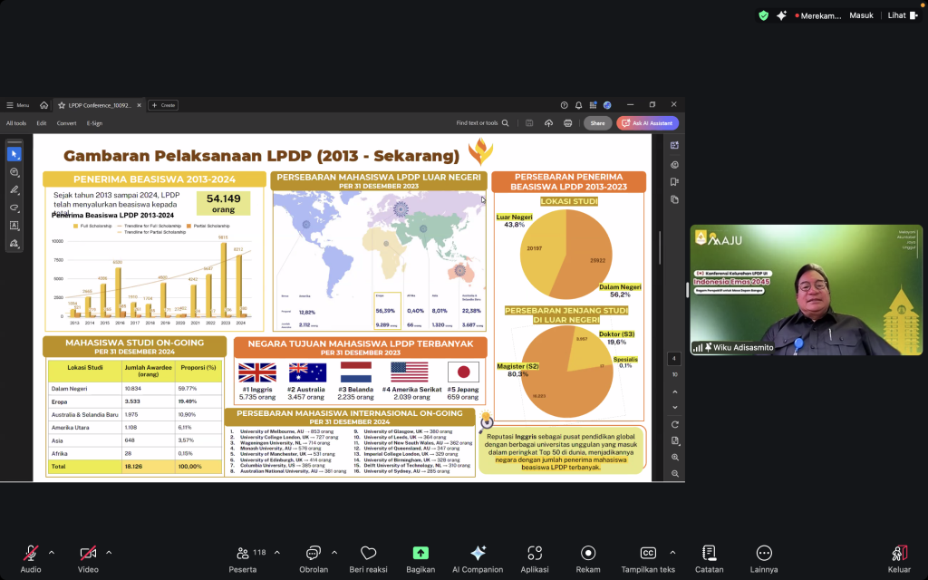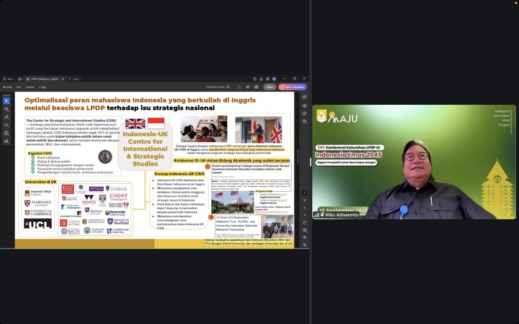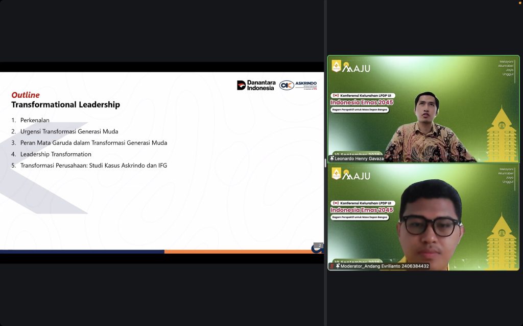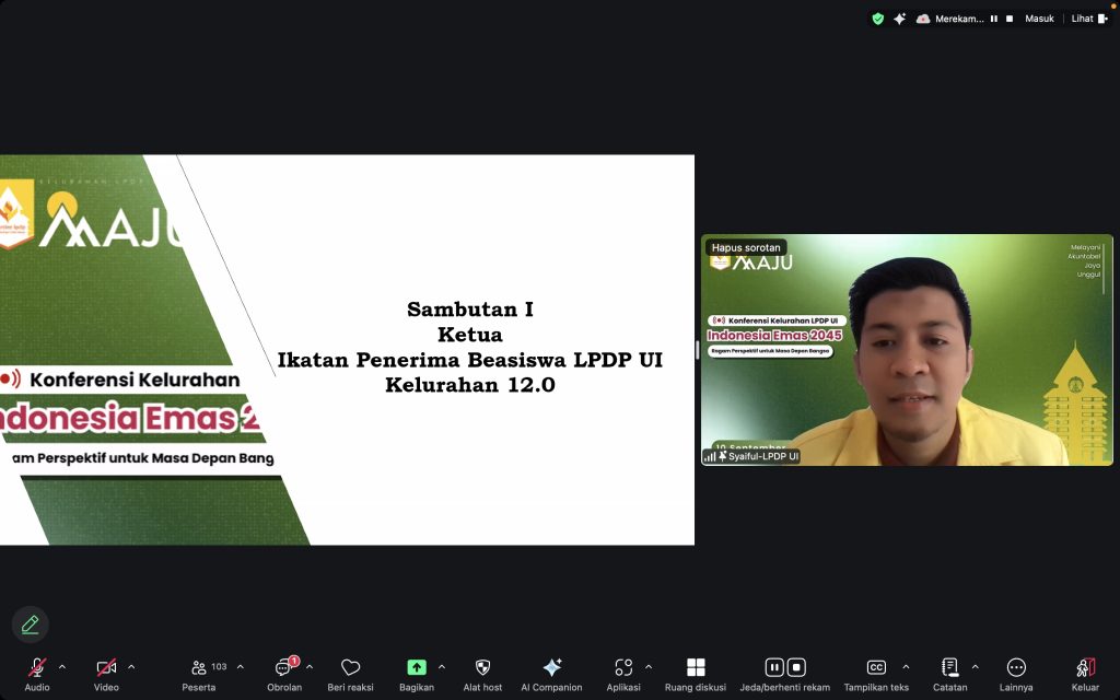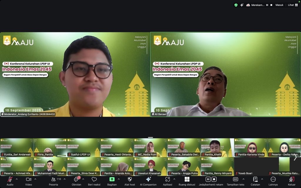 LPDP UI 12.0 sukses menyelenggarakan Konferensi Kelurahan LPDP UI 2025 bertajuk “Indonesia Emas 2045: Ragam Perspektif untuk Masa Depan Bangsa”. Kegiatan yang berlangsung pada Rabu, 10 September 2025 secara daring. Kegiatan konferensi perdana yang dilakukan oleh keluarahan UI ini merupakan wujud kongkrit menggagas berbagai perspektif untuk masa depan bangsa Indonesia dalam kerangka Indonesia Emas di tahun 2045.